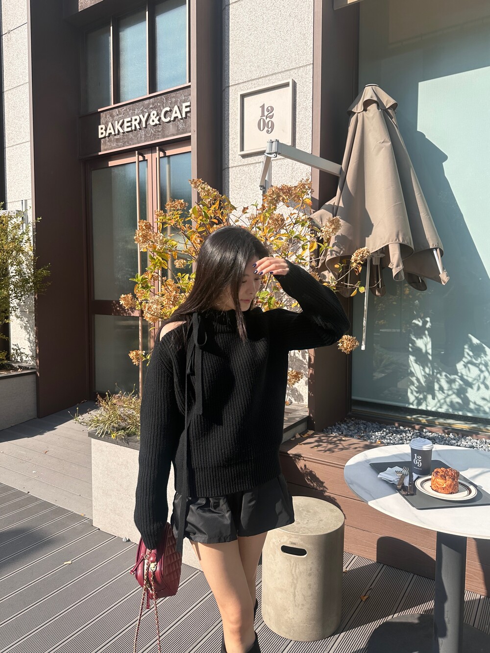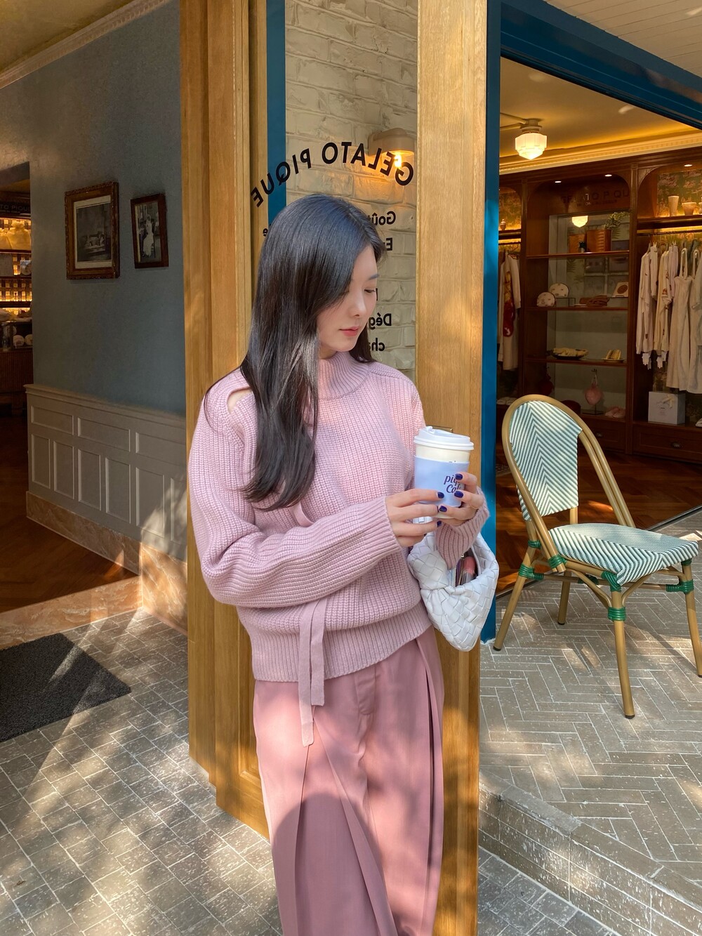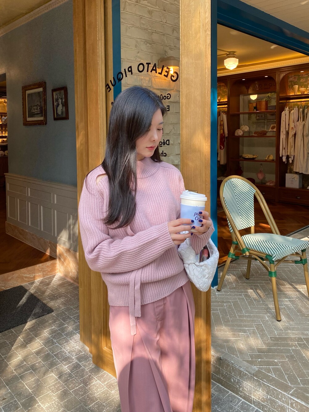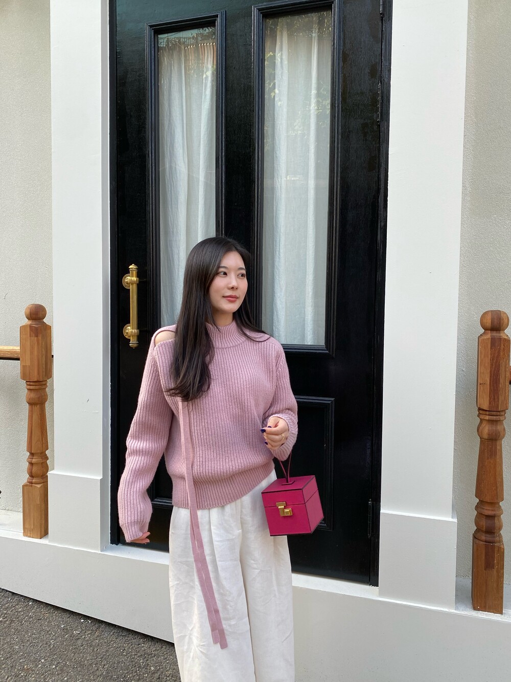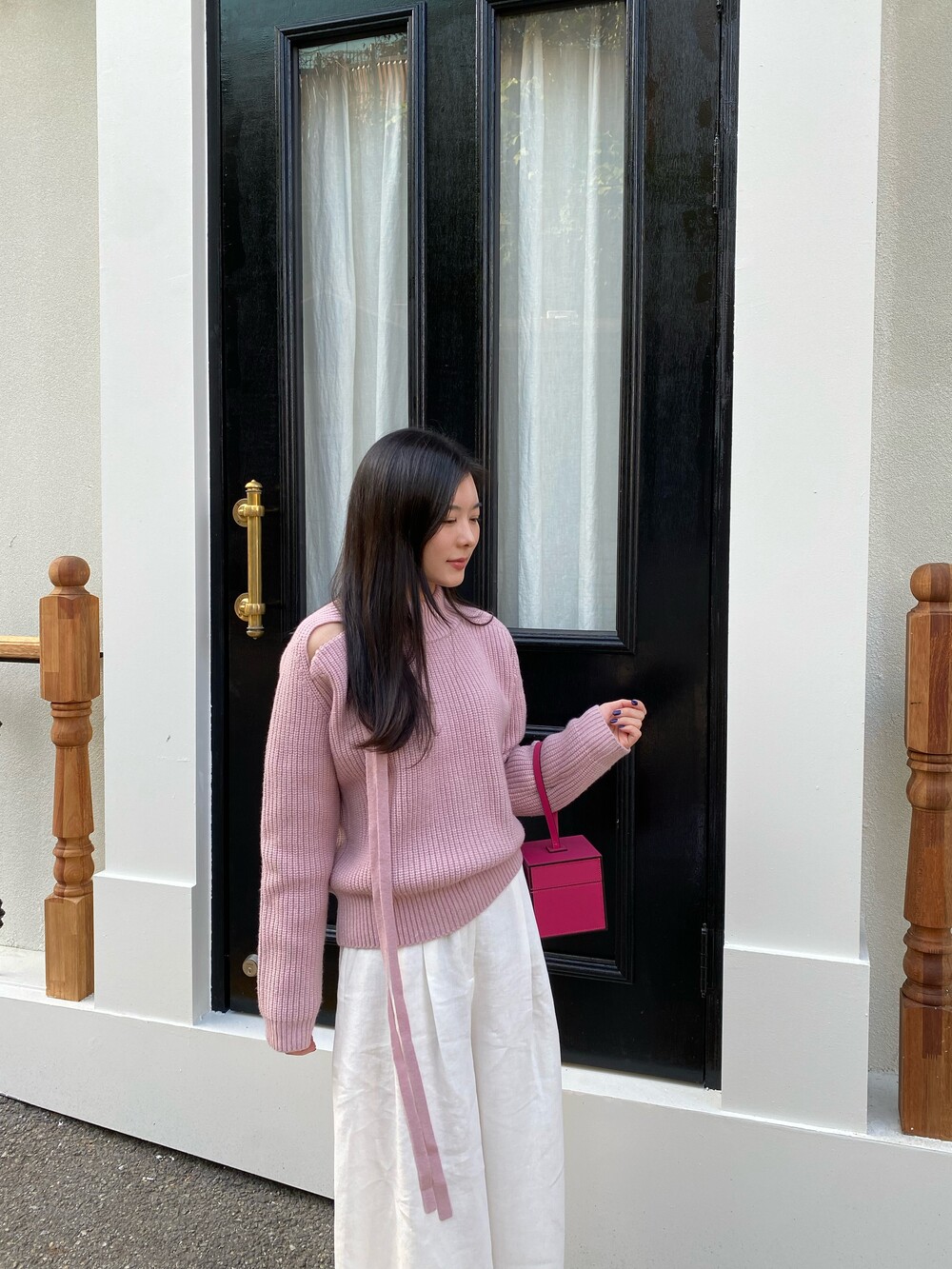 어깨부분에 트임 장식 포인트와 니트 끈으로