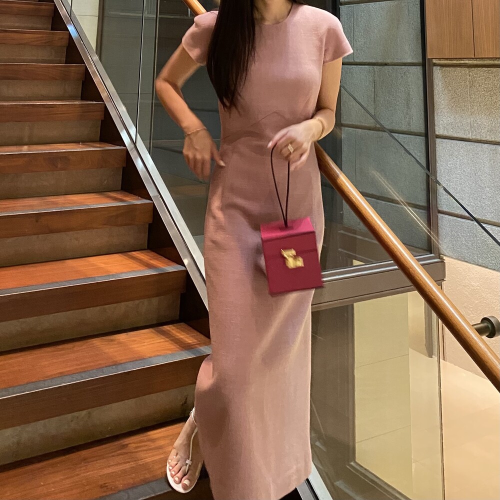 제작된 톤다운된 인디핑크 컬러의 드레스입니다.